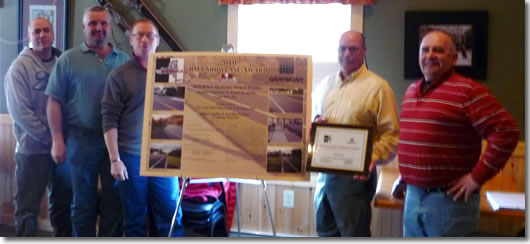 November 1, 2010, Plattsburgh — This November Graymont Materials (NY) received a prestigious Hot Mix Asphalt Showcase Award given by the New York Construction Materials Association (NYCMA). These awards are given annually by NYCMA and are highly competitive. Graymont received their award for providing asphalt, subbase and ready mix concrete to the reconstruction of Rt 9N in the hamlet of AuSable Forks (a small village commonly called the Gateway to the 1980 Olympics in Lake Placid). Luck Brothers,Inc., a Graymont customer also received an award as did the NYS Department of Transportation.